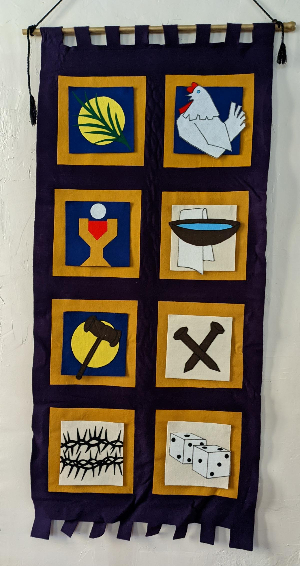 Here is a description of the symbols on the Lenten Banner in the Sanctuary and what they represent. References to them can be found in the stories of the Gospels of Matthew, Mark, Luke and John, although just one Gospel was cited.